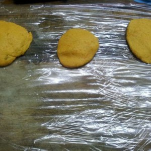 南瓜蒸熟,糯米粉适量,搅拌一起醒一会儿