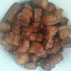 放入五花肉 八角 香叶 陈皮 干辣椒 姜片 小葱 一点老抽 和一点生抽 加水大火烧开,然后转小火烧50分钟