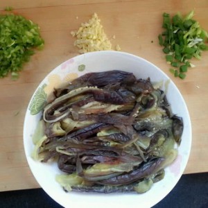1.先把茄子洗干净,在锅里蒸5-10分钟,然后用筷子拨开成条状。把青辣椒、蒜瓣、葱末切好,放入盘中。