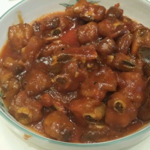 这是最后产品。 接着上个步骤。接下来我们把炸至金黄色的排骨放进糖水里面 加番茄酱~醋,盐翻炒。就好了