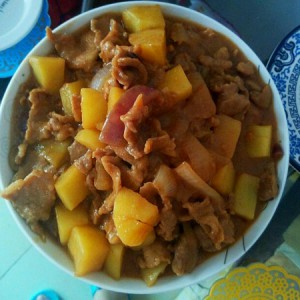 锅烧热后下洋葱炒香,加入裹上淀粉的猪肉翻炒一下,不用等全部变色下土豆一起翻炒,等肉炒到大部分变色少部分还能看到肉色的时候加没过土豆的水。