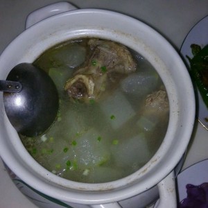 捞起排骨放入汤锅,加姜片,大火炖半小时,然后放入冬瓜,炖10分钟后,加盐,味精调味,小火炖20分钟