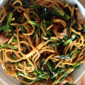 把锅烧热后放油(多一点没事,因为面条没油不好炒也不好吃)将腌好的肉放进锅里炒几下,在把韭菜放进去炒,韭菜炒的差不多熟了再把面条倒进去一起翻炒,最后加入酱油入味,调色。