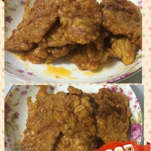 腌制好的肉片先裹一层面糊,再放入干面粉中压一层干面粉,抖掉多于的面粉后当油锅炸(闲麻烦可以省略),油温不能太热