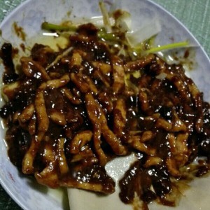 油热后入面酱炒香,放葱,姜,耗油,老抽,生抽,糖盐,料酒,下肉丝炒匀后出锅