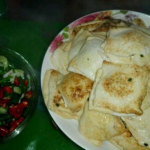 放上拌有韭菜的肉末,每块薄豆腐均匀放肉馅。