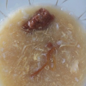 煮五分钟左右,打一个鸡蛋到汤中,搅成蛋花。此时调成小火