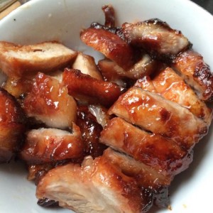取出,放在烤盘上风干,刷蜂蜜和剩下的酱,中层烤20分钟,取出翻面再刷一次所有东东,再烤20分钟。一定守在一旁哦,不要考糊了。