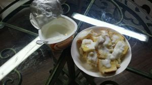 取出晾一下,翻一下让水份挥发,面包变脆用刀切成小方块(公司饿货多,不切不够分),淋上果肉酸奶(原牌是冰淇淋或蛋黄浆,我嫌太腻,换成酸妙)成品啦……三秒种分完,比抢红包还快……