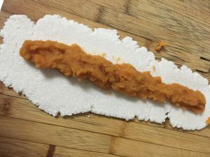 西米用擀面杖擀成薄薄的长条、把事前准备好的红薯捏成长条放上面(如图)