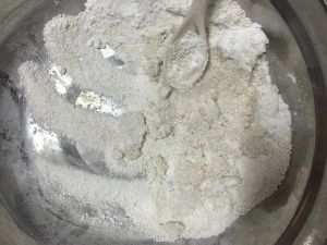和成大概这样(可以水多一点不然太干后面不好擀摊开)先用保鲜膜封好,放旁边待用,不然干得很快。