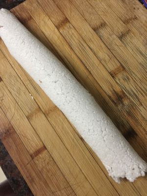再卷起来,切段、放锅上蒸20分钟左右(蒸盘上一定一定要 “先摸层食用油或者铺张油纸” 在上面)不然蒸熟了会拿不起来哦!!!切记!!