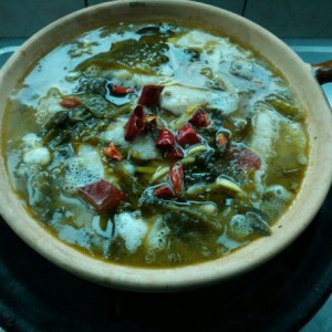 热油,鱼骨下去微煎,倒开水,下酸菜煮,水沸腾后,用手把腌好的鱼片一片一片下到汤里,不要搅动,大火煮2分钟,微熟后锅铲搅动一下鱼片,关火。倒入砂锅里。把花椒碎洒到汤面上,另起锅热油,丢生姜丝和干辣椒爆,然后趁油热一起倒入花椒碎上。