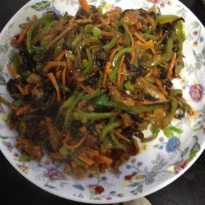 倒入胡萝卜、青椒丝、黑木耳、翻炒入味。炒制断生后,倒入肉丝一同翻炒。再倒入调和好的糖醋汁。中火烧。