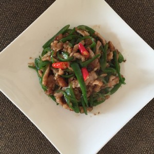 锅内加油八成热,爆姜蒜,炒香后加入肉丝。