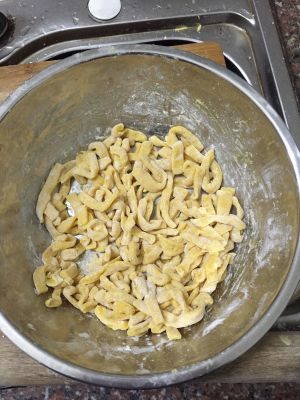 把面饼切成条 细一点比较好 有心的话可以揉成圆形的面条