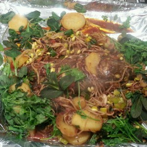把炒好的菜都倒在烤好的鱼身上,油都渗透到了鱼肉里,超级香~然后再放入烤箱烤五分钟,最后撒上香菜、薄荷叶2-3分钟……哇咔咔,华丽丽的滴口水阿·····