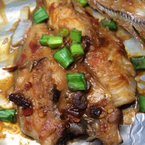 铺上锡纸上面刷上一层油,油上面放葱段,最后放上黄鱼。