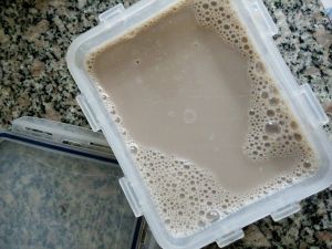 把豆浆趁热迅速冲入放了内酯溶液的容器中,稍微搅拌一下,给容器加盖,放置于温暖的地方,15分钟豆花就做好了。想吃咸的就加酱油葱花,想吃甜的就加点蜂蜜啊红豆沙啊,自己发挥想象吧~~~~~