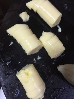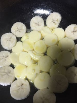 香蕉切片 。下油、下豆腐(建议豆腐翻边后再放香蕉)
