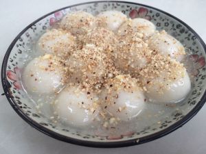 另起锅,加水大约50克,白糖60克烧开,下冷却好的糯米团,水收汁浓稠装盘,撒上花生碎和芝麻。