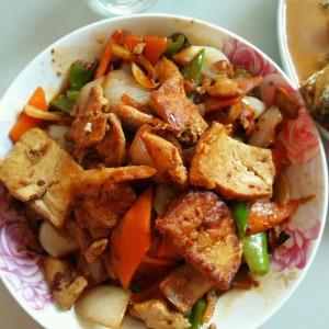 煎好了以后就依次放入胡萝卜、洋葱、青椒,加适量盐,一勺老抽,老干妈,也可以适量再加点白糖,翻炒的差不多时候加入鸡精,这道菜就完成啦!