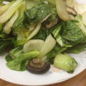 锅内油烧热 放入青菜根 和香菇片爆炒
