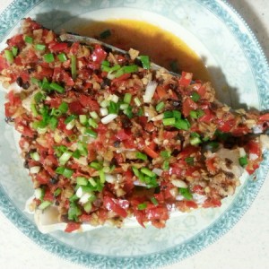 料理炒三五分钟后,均匀铺在鱼头上。入蒸锅蒸10分钟,出锅撒上葱花,开吃吧!