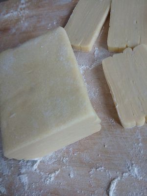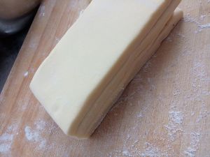把叠好的面团擀成厚约1厘米的四方大片,切成大约6-8厘米宽的四个长条长条。刷一点水,4层叠加起来。