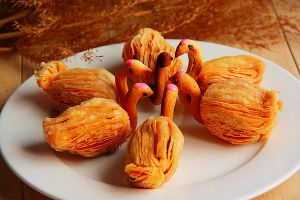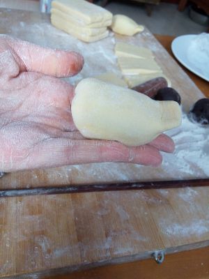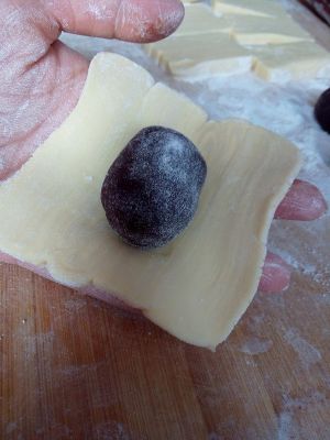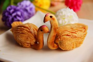 轻轻擀开面片,包入豆沙馅儿。包得时候注意看黄油和面片的纹路是顺着天鹅身子呈一个方向的。