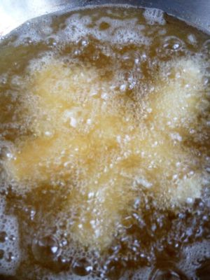 全部包好后,入油锅炸至金黄色。油温在大约120度左右的时候下入,小火炸制。