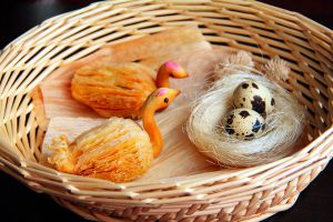 包得时候把面片接口边沿抹上蛋清粘合。一侧捏成上翘的尾巴,另一侧捏成凹陷的脖颈,留出插天鹅头的地方。