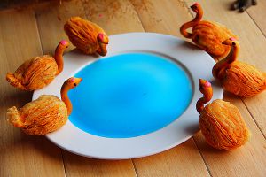 把辅料中的面粉、黄油、水、糖和成面团,捏成天鹅头,入烤箱烤成金黄色,用巧克力画出眼睛和鹅冠子,把天鹅头插入鹅身子即可。