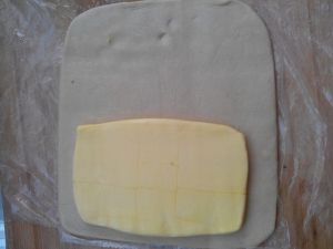 把面团擀成黄油的2.5倍大的薄片,放上黄油。