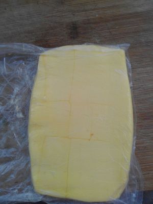 把黄油装入保鲜袋,擀成3、4毫米厚的薄片,擀之前用擀面杖轻轻敲打黄油,增加延展性,会更好擀。