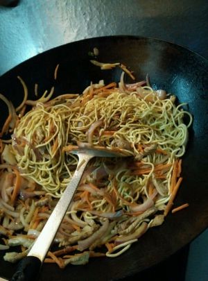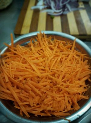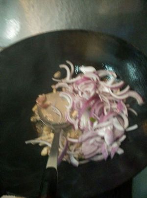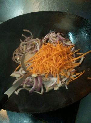 洋葱丝软了一些就倒入胡萝卜丝,等胡萝卜丝软了些,就加入盐翻炒几下