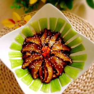 将炒熟的菇片放在油菜中心位置。撒上炒熟的白芝麻。
