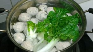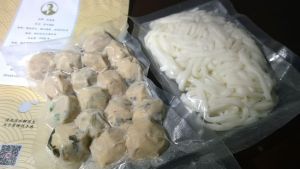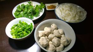 解冻后的肉丸和粿条,切上些许葱花,带上几片青菜