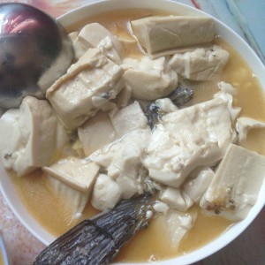 然后加入足够的水煮开后放入切块的豆腐中火慢炖。然后加点盐鸡精起锅以后加点胡椒粉就可以了。