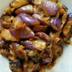 炸完茄子后锅就一点油(不要留太多),放入五花肉和蒜一起翻炒,炒至五花肉变成微黄,放入茄子,放适量盐,白糖,耗油,翻炒片刻既可