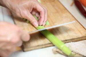 锅中注入清水,水沸后放入虾仁和西芹焯水约1分钟沥水捞出备用。
