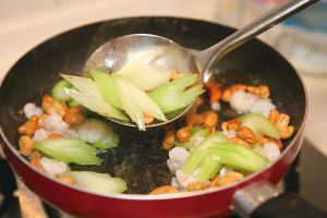 在锅中倒入少许炸腰果时的剩油,油热后放入西芹、腰果和虾仁翻炒,加入盐、糖和鸡精调味出锅。