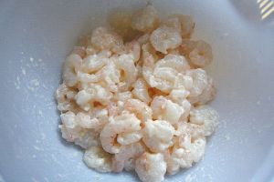 在干净的碗中,放入虾仁、盐、糖和淀粉并抓匀。