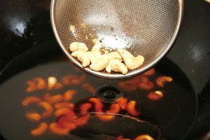 热锅倒油烧至8成热时转小火,放入腰果炸至金黄色沥油捞出备用。