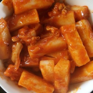 放入年糕翻炒至软糯,最后放去白菜叶出锅