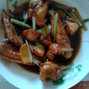 在锅里倒少许油,放入八角爆香,加入姜片。放入腌制好的鸡翅煸炒至鸡肉发白,鸡皮带金黄色。加入可乐200ml,小半碗水,少许酱油,转小火。