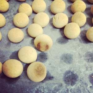 烤盘垫纸,面团搓成一颗一颗小圆球。烤箱175度预热。然后入烤箱烤约10分钟左右。注意上色不要烤过头。