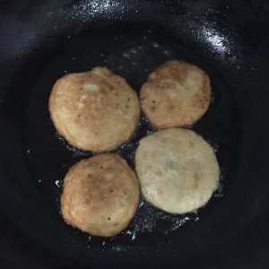 手掌沾点干面粉,轻轻的把刚刚那个包子型压扁,不能大力,不然会露馅,萝卜里面有水份,破了会不好煎,炸油出来