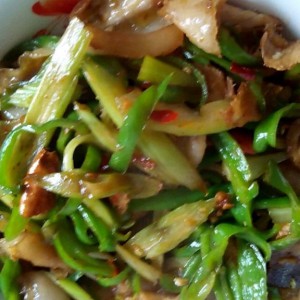 在把肥肉和豆干一起放入锅里炒几分钟.把盐.鸡精.郫县豆瓣.放入.就可以啦