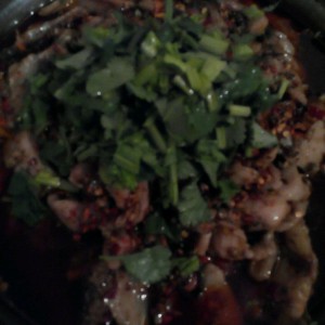 把调料包里的辣椒麻椒包均匀撒在鱼肉上,另起锅热油,冒烟后淋在辣椒上就好了,最后撒上香菜即可